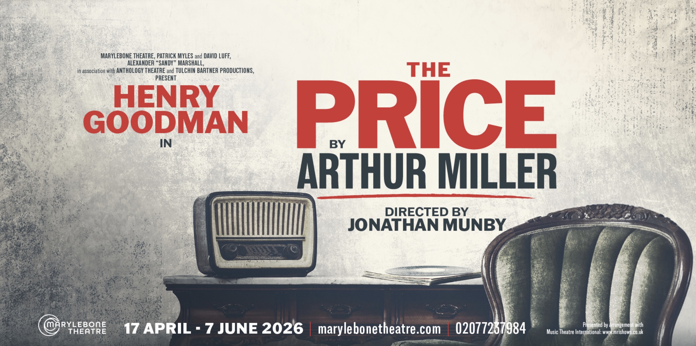 - The Price 17 April-7 June at Marylebone Theatre, Rudolf Steiner House, 35 Park Road, London, UK. Directed by Jonathan Munby with Henry Goodman. Further casting TBC. Set design by Jon Bausor. Call 02077237984 or check the website for more details.