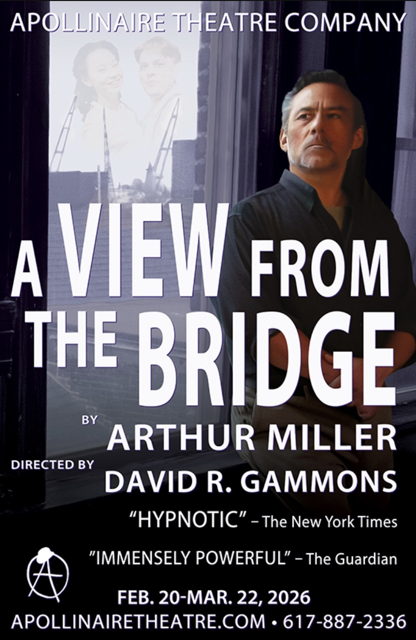 - A View from the Bridge 20 Feb.-22 March by Apollinaire Theatre Company, at Chelsea Theatre Works, 189 Winnisimmet Street, Chelsea, MA. Directed by David R. Gammons, with Jorge Rubio, Sehnaz Dirik, Naomi Kim, Andres Molano Sotomayor, Rohan Misra, Dev Luthra, Andre Meservey, David J. Kim, Miguel Dominguez, and Gabriel Pagan. Scenic and sound design is by Joseph Lark-Riley. Call 617-329-5350 or check the website for more information.